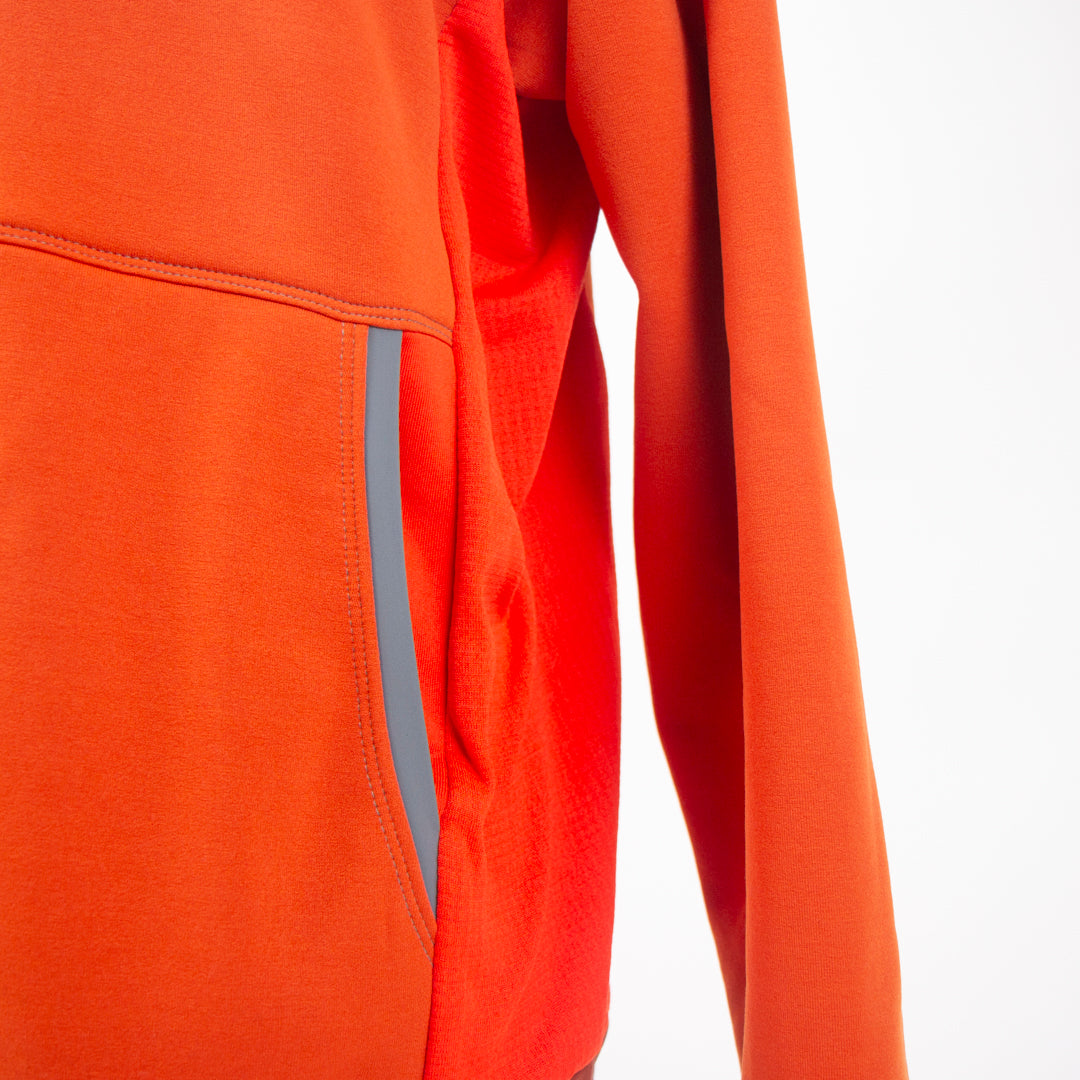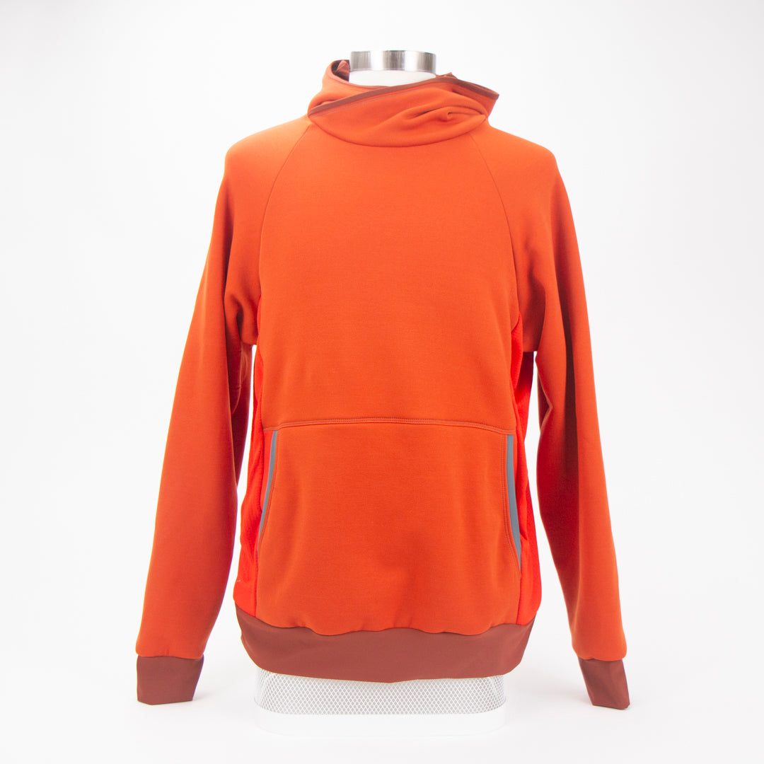 This unisex silhouette features raglan sleeves and curved side panels for a flattering, flexible fit. A structured front pocket adds utility, accented with unexpected pops of color for a fun, modern touch. The hood is slightly wrapped for added coverage, while the Lycra®-bound cuffs and waistband ensure a snug fit that stays in place. The hem is slightly longer in the back for full coverage during active moments, whether you're reaching, stretching, or on the move.