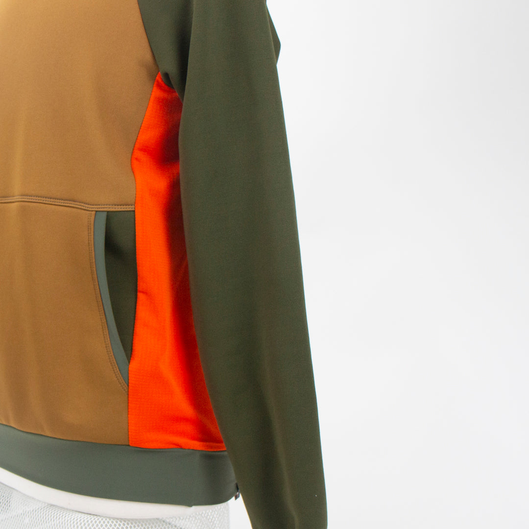 This unisex silhouette features raglan sleeves and curved side panels for a flattering, flexible fit. A structured front pocket adds utility, accented with unexpected pops of color for a fun, modern touch. The hood is slightly wrapped for added coverage, while the Lycra®-bound cuffs and waistband ensure a snug fit that stays in place. The hem is slightly longer in the back for full coverage during active moments, whether you're reaching, stretching, or on the move.