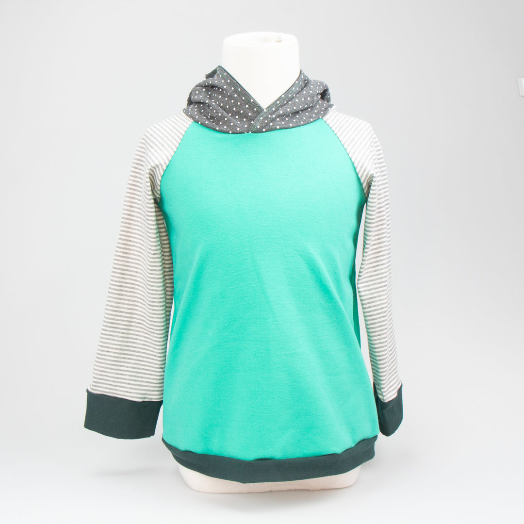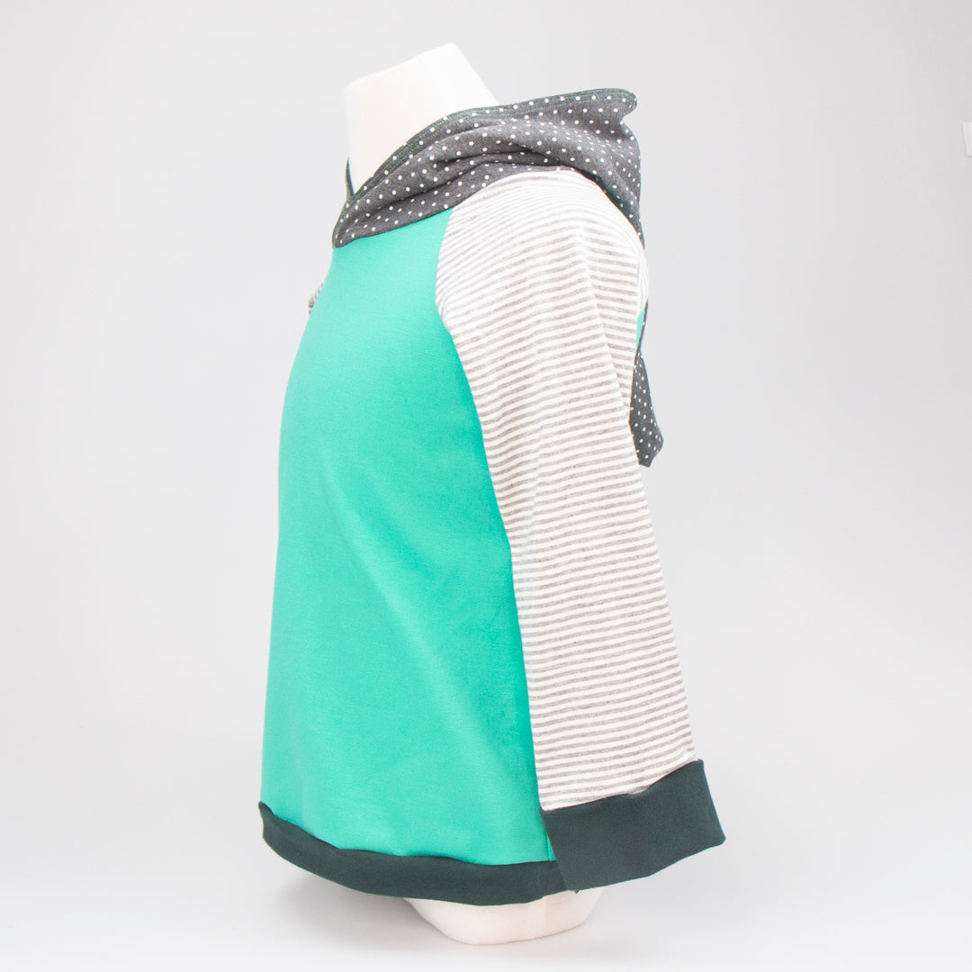 It's the go-to hoody for both lads and lasses. This pullover Elf Hoodie features a lined, pointy hood and contrasting sleeve cuffs. A generous fit allows the hoody to be worn more extended before it is outgrown and passed on. Your little one will stand out in the crowd. Made in Montana from upcycled deadstock fabric, this hoodie blends sustainability with style. If you are looking for older sizing, check out the Joey Hoodie!