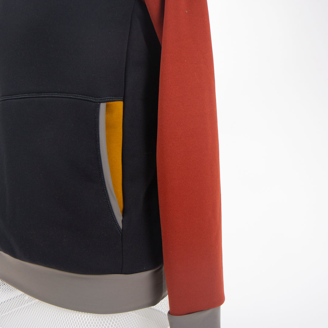 This unisex silhouette features raglan sleeves and curved side panels for a flattering, flexible fit. A structured front pocket adds utility, accented with unexpected pops of color for a fun, modern touch. The hood is slightly wrapped for added coverage, while the Lycra®-bound cuffs and waistband ensure a snug fit that stays in place. The hem is slightly longer in the back for full coverage during active moments, whether you're reaching, stretching, or on the move.