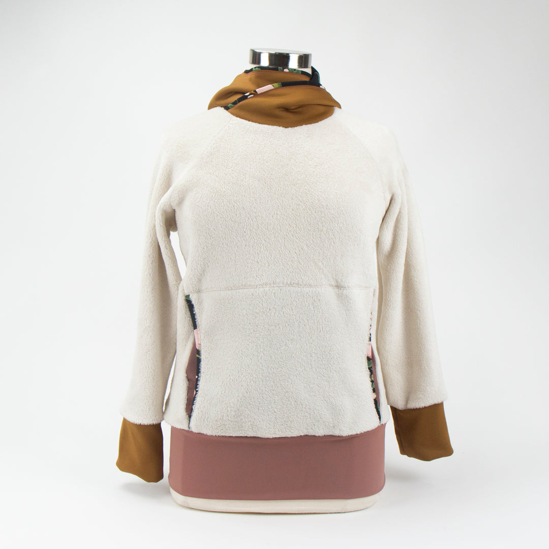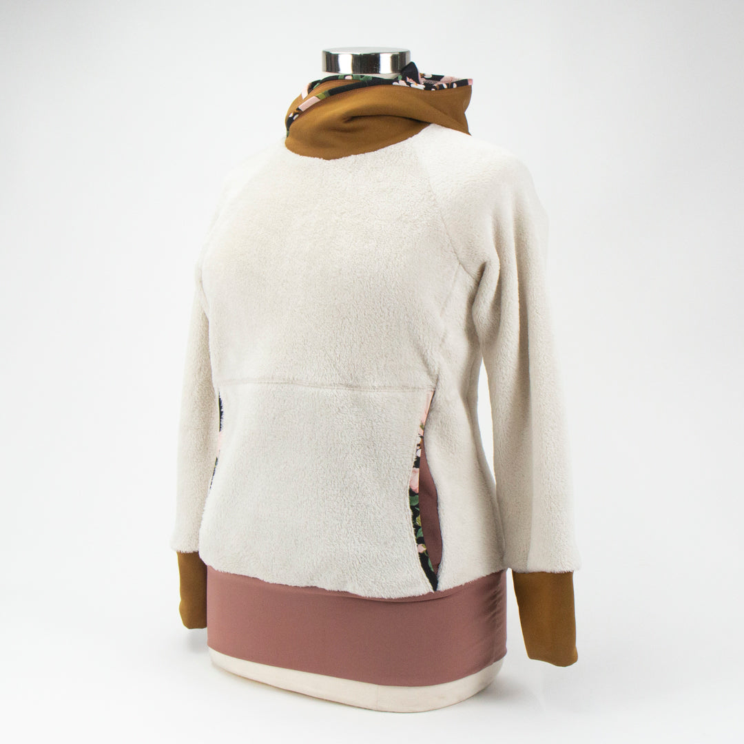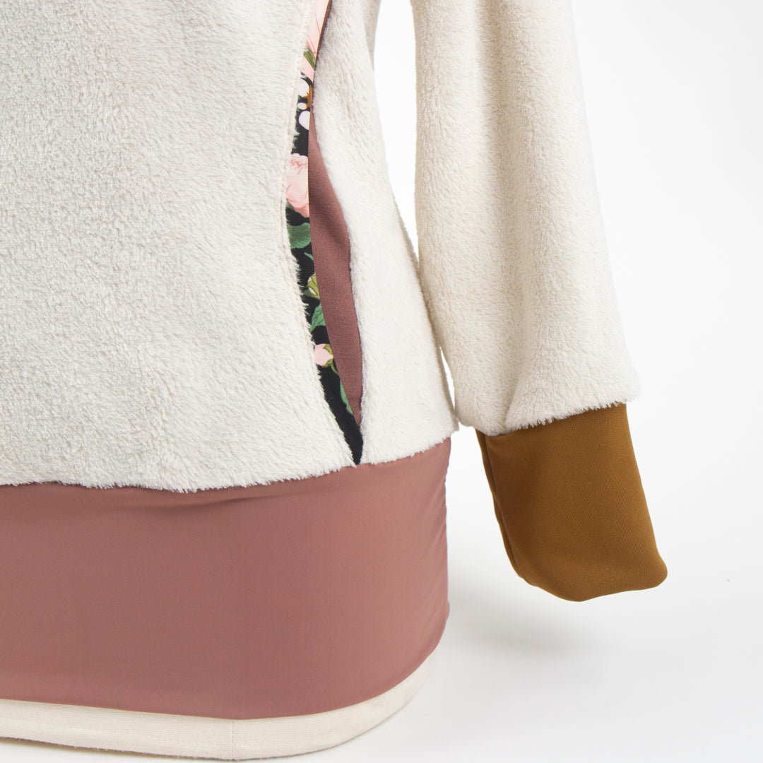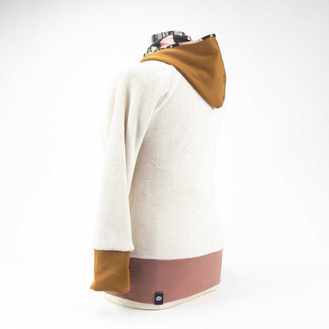 A floral Lycra hood lining adds a subtle, unexpected accent—bringing a quiet bloom to this winter-soft colorway. Designed with a raglan cut, banded waist, and a kangaroo pocket integrated into the front princess seams, the Ella Roo offers a flattering fit that moves with you.